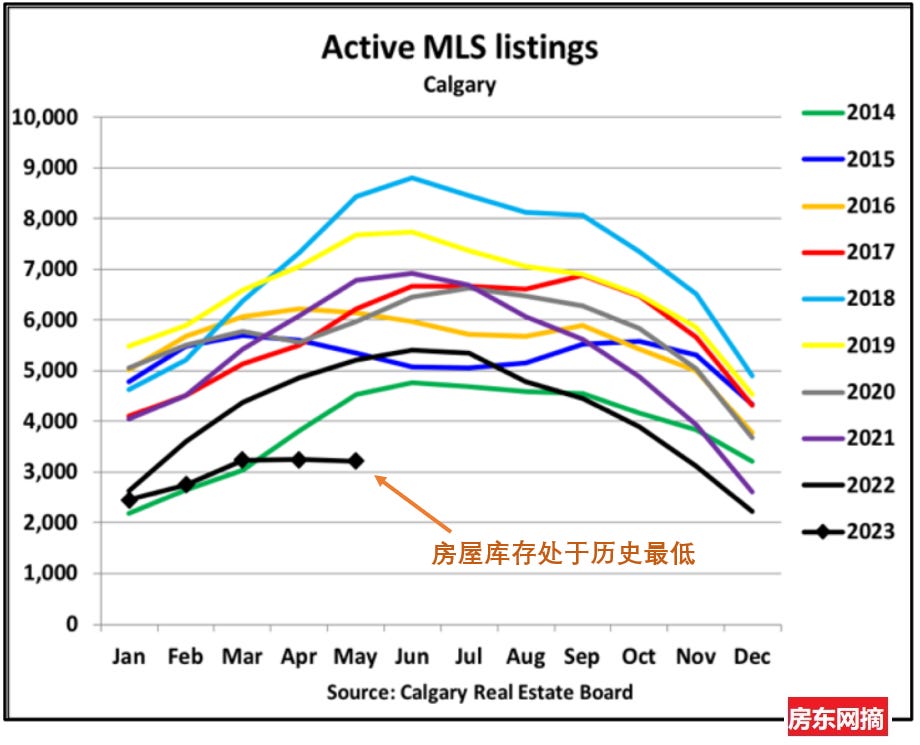 而在卡尔加里的房源不足,看下图房屋库存处于历史最低,导致价格上涨。
