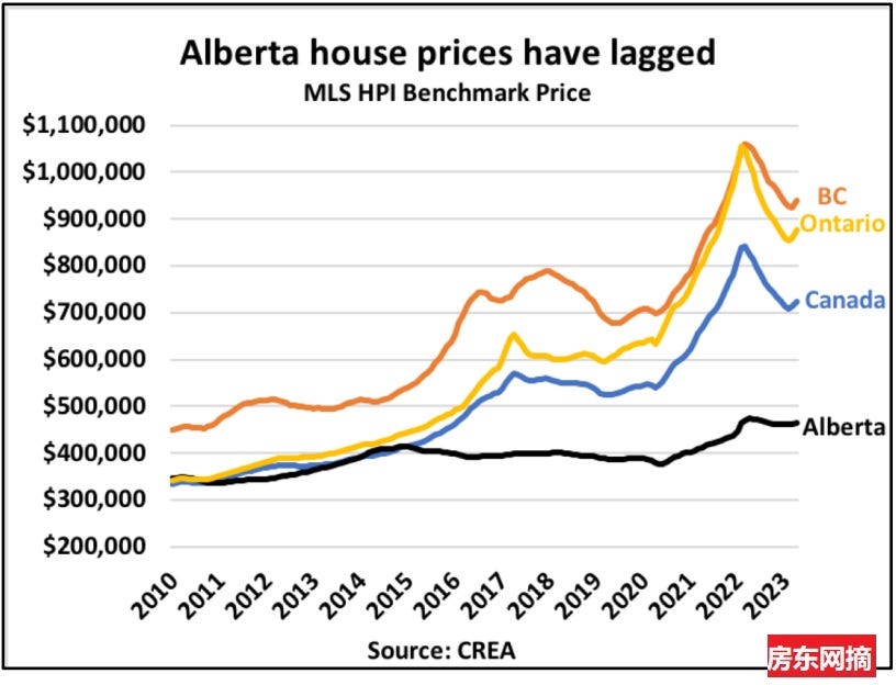 先来看卡尔加里所在的阿尔伯塔省的房屋价格自2010年来的变化历史,尤其是与BC和Ontario省的价格变化比较,很长一段时间Alberta省的房屋价格处于低增长的状态,现在处于价格追赶期。 见下图