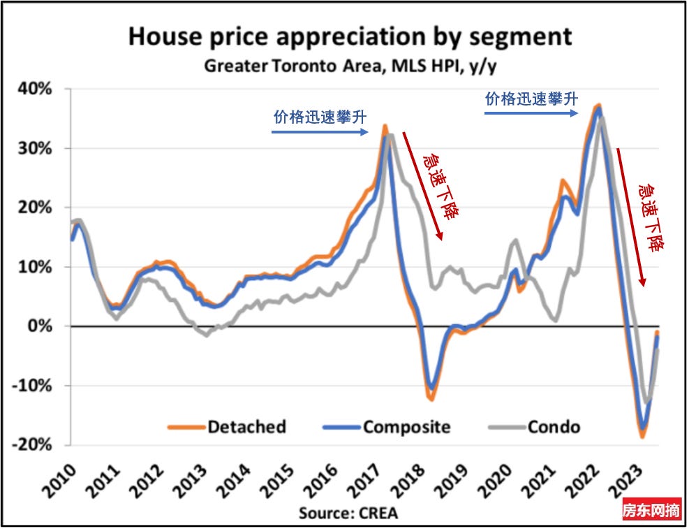 这是多伦多GTA地区独立房屋、Condo和各种房屋综合一起价格年同比变化对比图:大家可以从过去十年的角度来看看GTA房屋价格年增长变化的情况。 图中可以看出2017年和2022年相似的经历,年初都有惊人的增长速度,房屋同比增长均超过30%,之后就是迅速的下降。