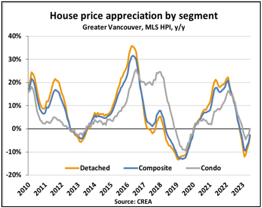 下图是大温哥华地区独立屋、Condo和各种房屋综合一起价格年同比变化对比,可以看出今年6月温哥华Condo的价格年同比为正,这是温哥华的Condo价格自2022年底以来首次出现同比增长: