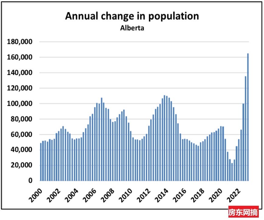 卡尔加里的房屋价格增长与近一两年的人口变化有很大关系,看看下图Alberta省人口变化,2023年第一季度比去年同期增长了170,000,买房需求较强。
