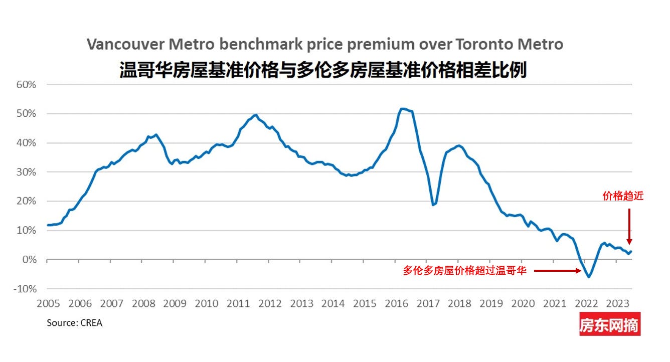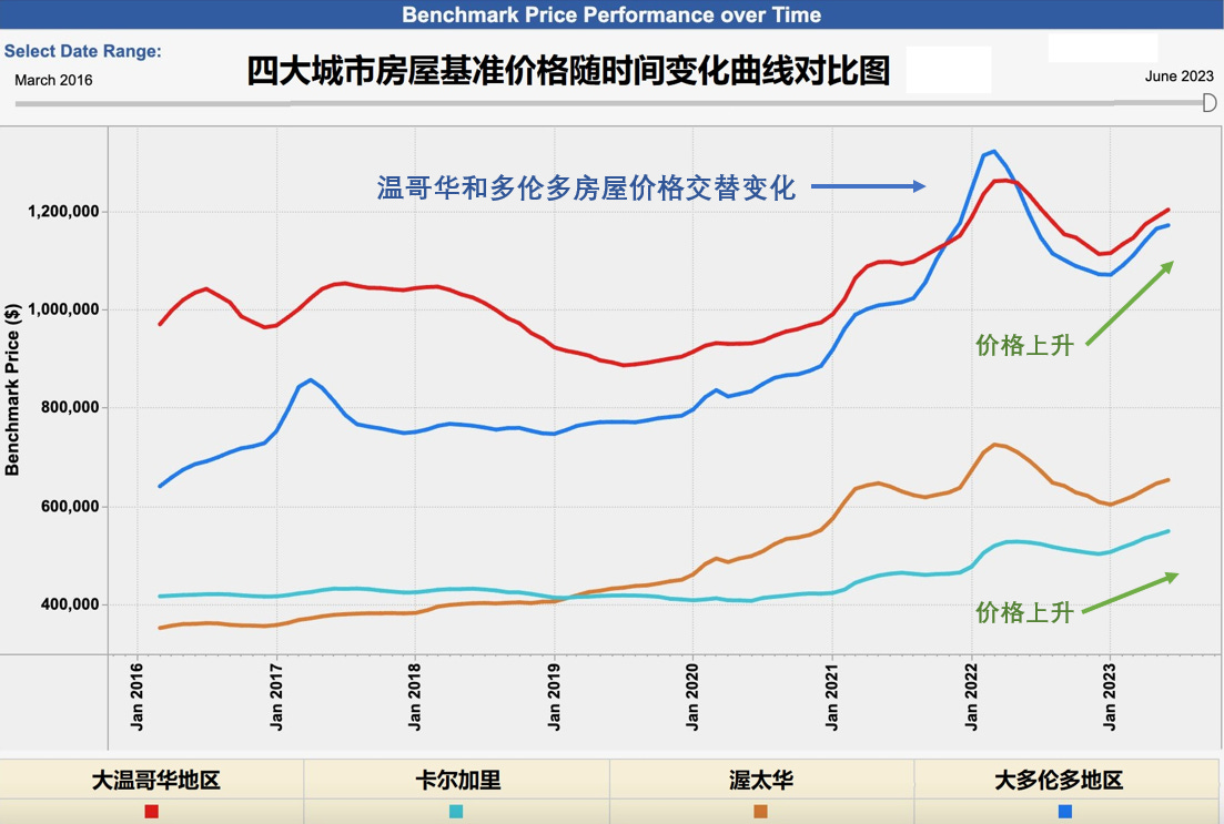 请特别注意一下;多伦多和温哥华两个地区近一两年价格的交替变化。