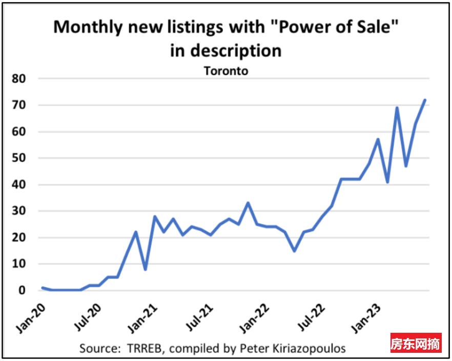 在这里咱们加一个不是有关房屋价格的信息:多伦多拍卖房屋的数量开始增多。 今年6月在房屋挂牌的描述中有“power of sale”的房屋数量有所增加,超过70个。 鉴于再次加息,利率上涨和劳动力市场出现疲软迹象,应该预计这一趋势将会继续,见下图: