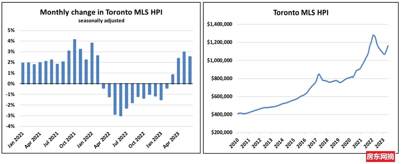 今年多伦多经季节调整的MLS房价指数在6月份再次上涨了2.5%月环比,使得价格在短短4个月内累计上涨了8.9%。价格几乎已经回到年初的水平。看下图