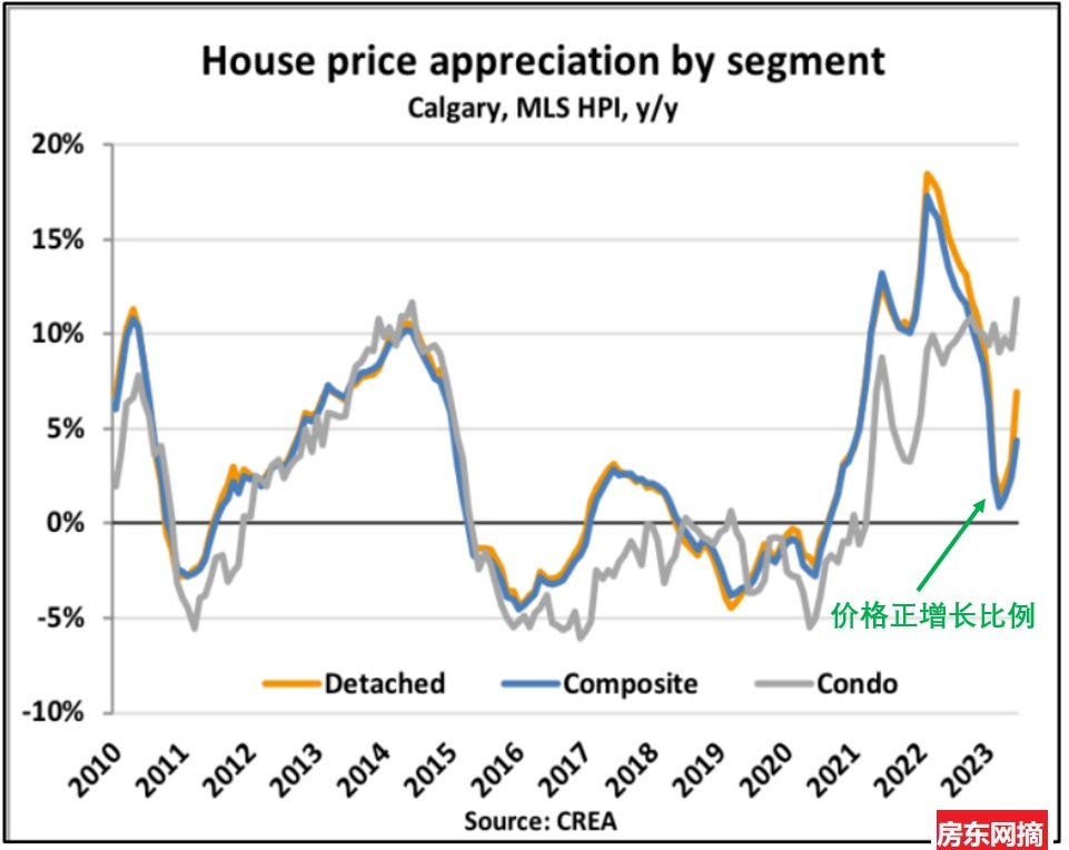 下图是卡尔加里地区独立屋、Condo和各种房屋综合一起价格年同比变化对比,可以看出该地区与温哥华和多伦多不同,这一两年房屋价格增长比例均为正值,只有增长幅度大小的不同,每年的价格都在增加。
