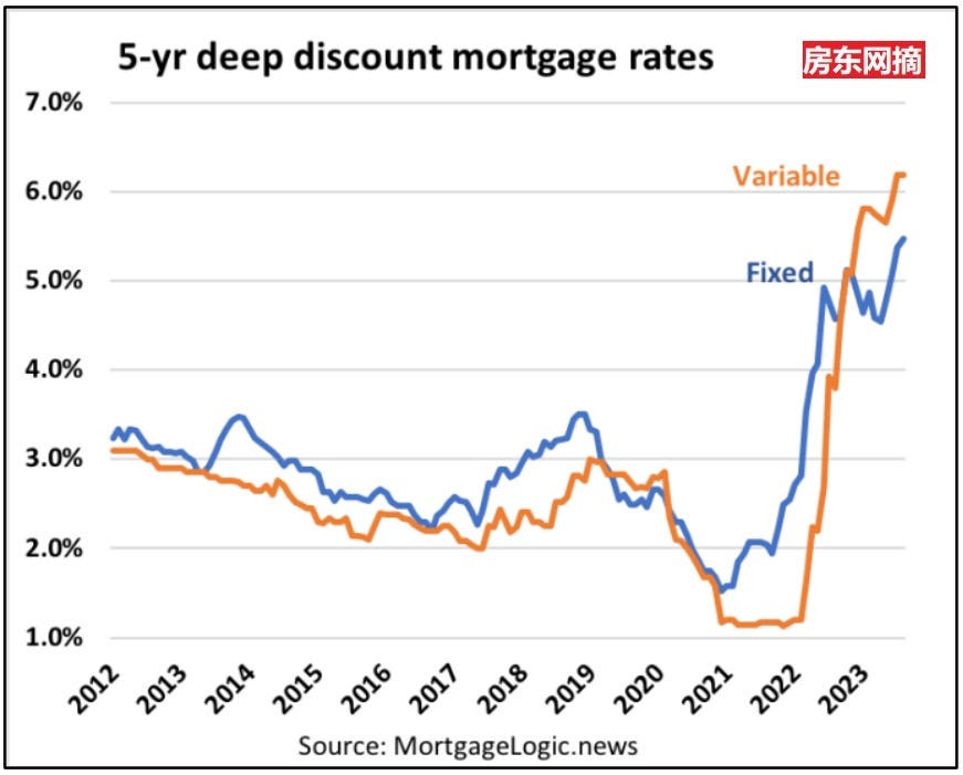 过去一周,固定抵押贷款利率上涨了7个基点,继续对购房能力产生压力。下图是5年固定利率和浮动利率的变化曲线图: