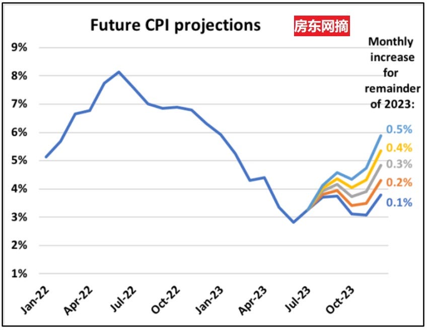 事实上根据专业分析和预测,如果CPI在今年剩余时间每月增长0.2%,到2023年底的通货膨胀率将超过4%。如果CPI平均每月增长0.3%(与过去6个月的平均水平一致),通货膨胀率将接近5%。