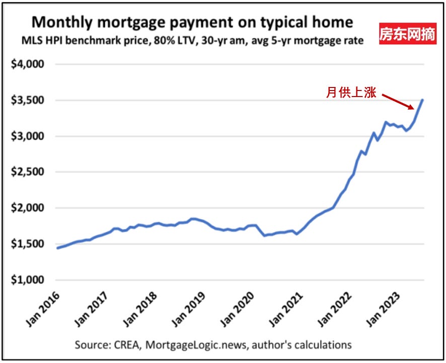 在加拿大拥有一个普通的房屋,家庭的抵押贷款所需的月供已自3月份以来上涨了15%或$400,见下图: