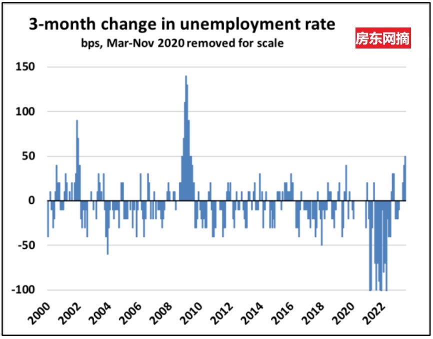 加拿大劳动力市场也正在显著冷却。失业率在3个月内上升了50个基点或0.5%,这种增长在历史上常常预示着经济衰退,见下图: