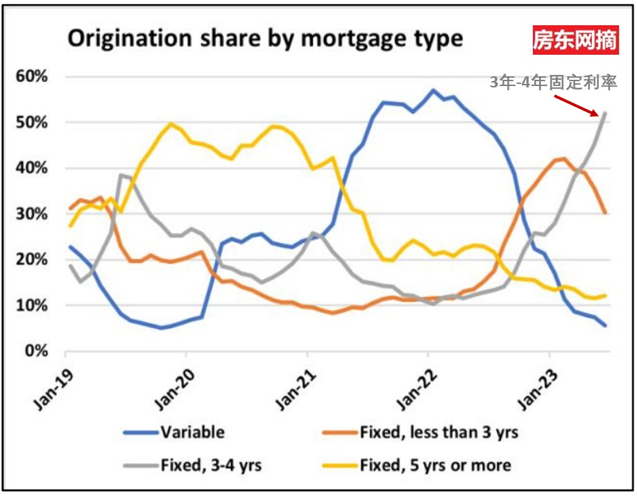 据贷款行业消息:目前贷款看到一个巨大的转变,即大量转向3年期固定利率抵押贷款,其中3年和4年期的贷款现在占所有新发放贷款的一半以上,见下图。
