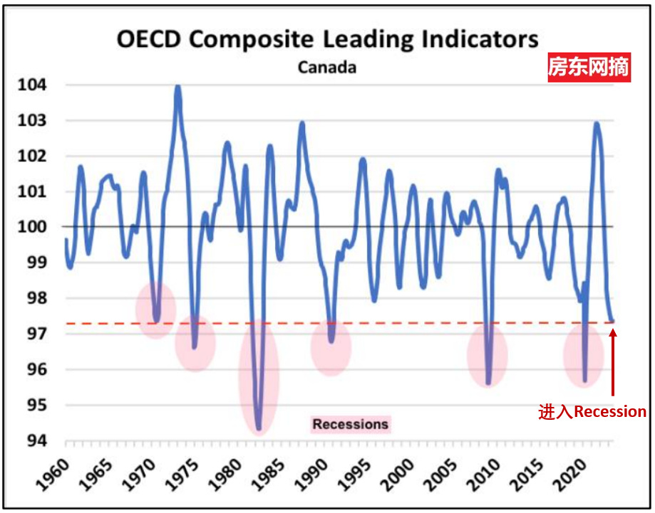 不少业内专家们相信:经济衰退可能在今年晚些时候到来,经济很可能已经在迅速冷却的过程中。OECD为加拿大的综合指标显示,加国经济已经跌到了60多年来预测经济衰退的水平线附近:
