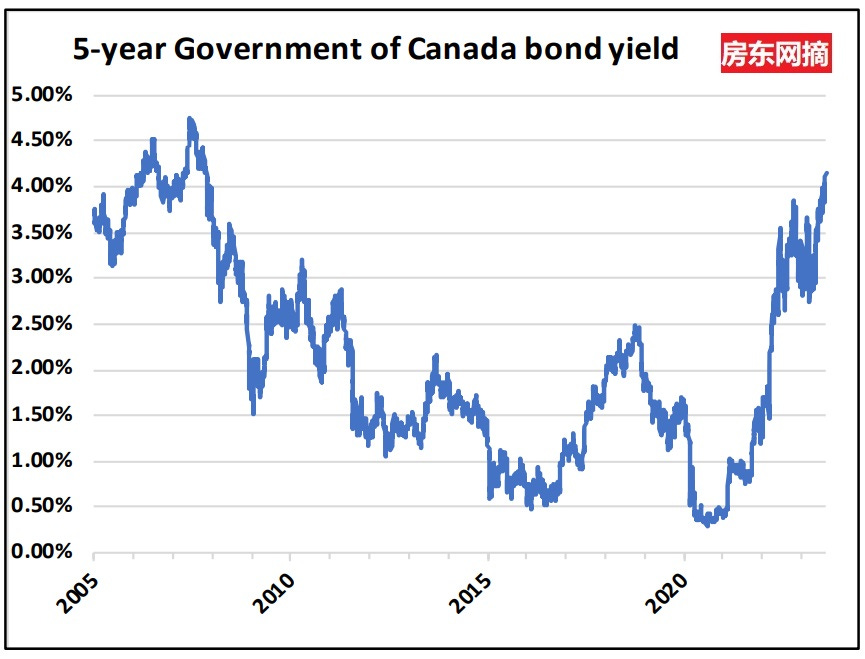 当前市场上不少人预计到2025年底隔夜利率会保持在4%,这意味着从现在起两年半的时间内,5年固定利率仍然会在5%中位数范围内,但也有不少人认为这似乎不太可能。